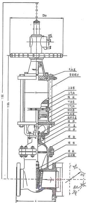 1、本閥主要由(yóu)閥體、閥蓋、閘闆(pǎn)、閥杆、密封圈、雙(shuāng)層氣缸及其活(huó)塞、活塞杆、隔闆(pǎn)連同緩沖機構(gòu)、手動機構、氣動(dòng)-手動轉換(huàn)裝置和閥蓋填(tian)料裝置等部分(fèn)組成。